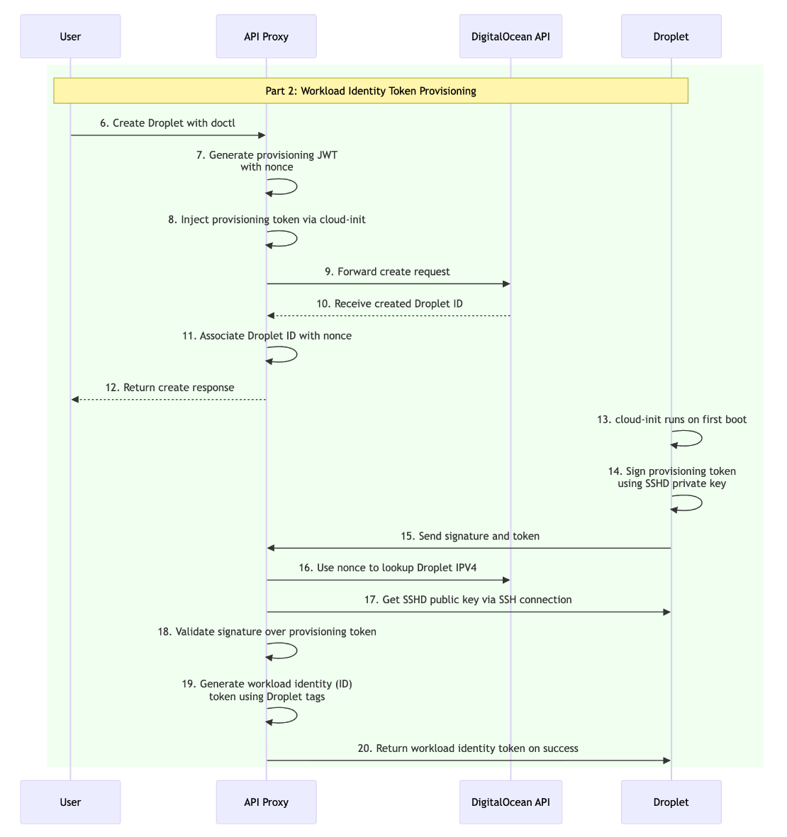 The application adds the workload identity token to the Droplet after successful completion of signing and validation of a provisioning token done via cloud-init. On first boot cloud-init executes the user_data