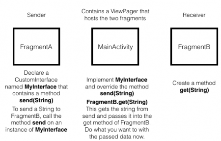 Intents are only usable for sending data on an Activity level. To pass data between fragments we need to create our own interfaces. The flow to send a String data from one Fragment to another is shown below.