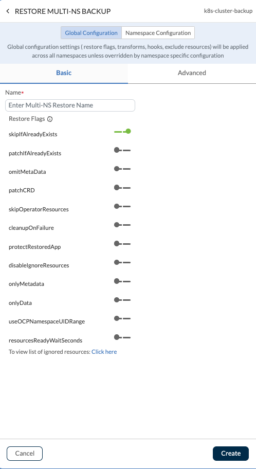 Enter a Restore Name for the restore custom resource creation. Once you provide the name, you can map all the important namespaces from the backup to the namespaces where you want to restore the data. In this case, select Namespace Configuration in the configuration pane and then select the desired namespaces.